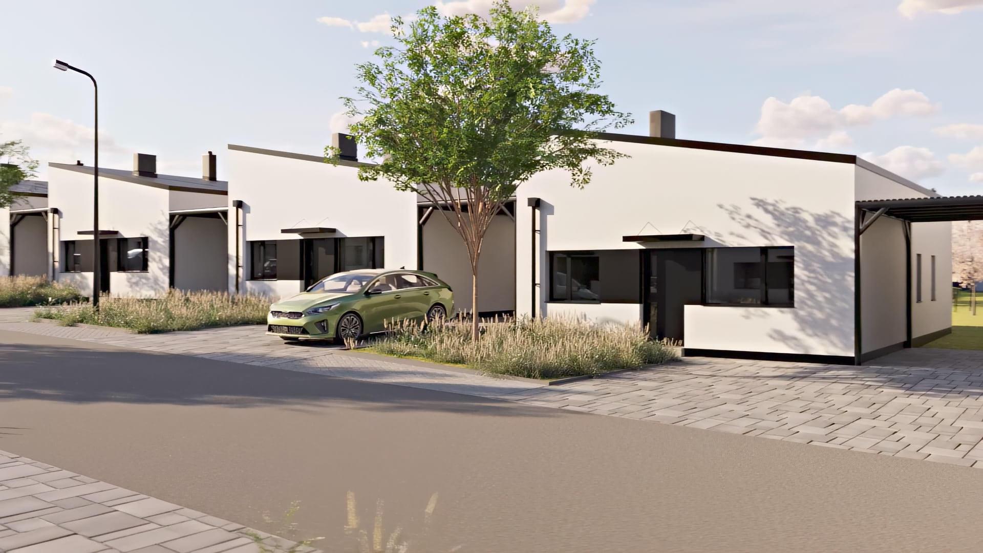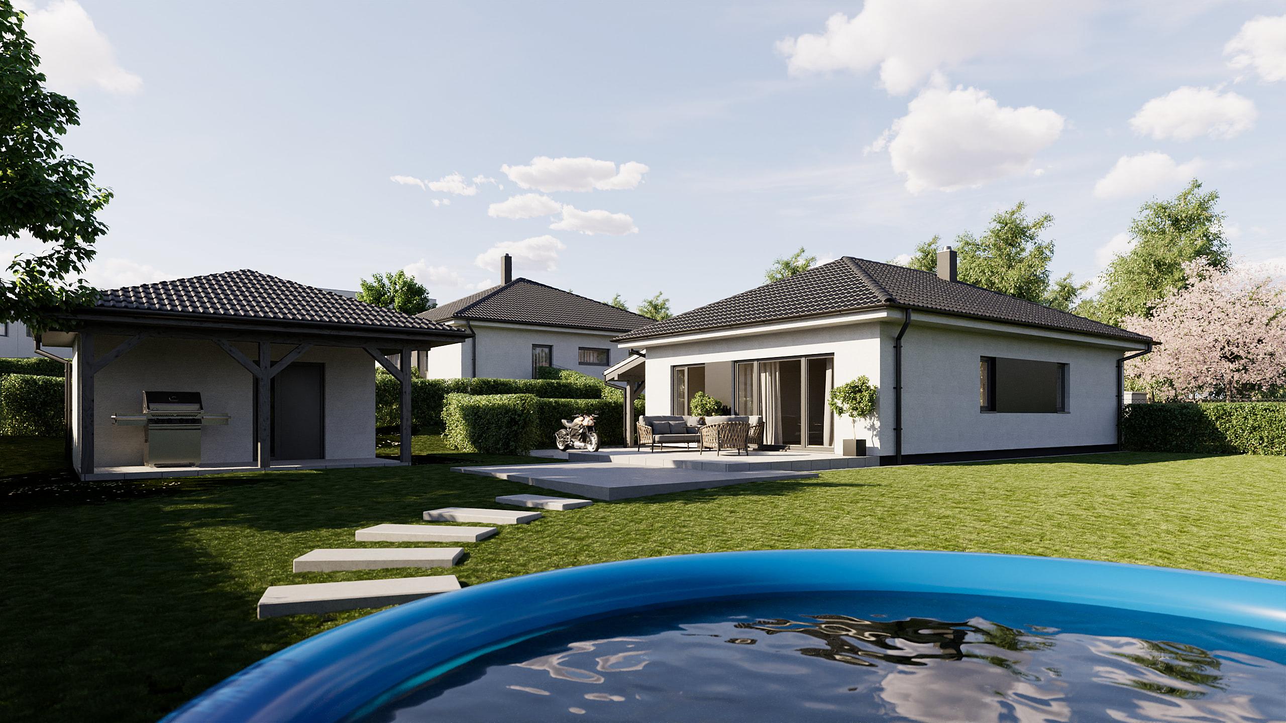 Naše ověřené kombinace dodávky domu na klíč zahrnují zděný dům s vnějším zateplením 180 mm polystyren, bílou silikonovou nebo silikátovou omítkou, plechovou pultovou střechu nebo valbovou s betonovou taškou, antracitovými 6 komorovými okny s izolačním trojsklem, zpevněnými plochami, přípojkami elektřiny, vody, kanalizace, výsadbou trávníku, plotem a krytým stáním pro auto podle typu domu.